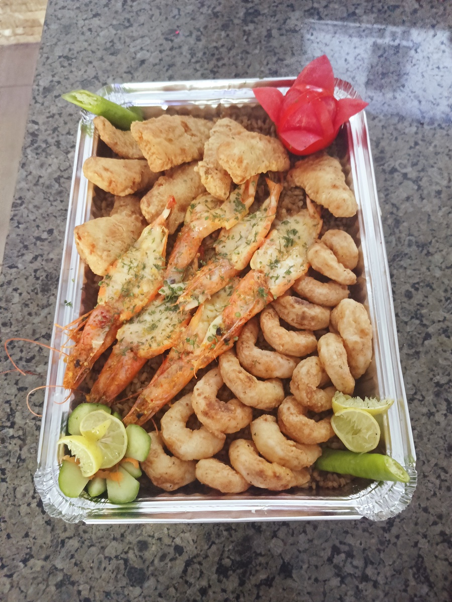 لو يومك محتاج روقان، الصينية دي هي اللي هتظبطه! ميكس رهيب بيجمع بين ربع كيلو وربيان (جمبري) باترفلاي دايب في صوص الزبدة، مع ربع كيلو جمبري كريسبي بخلطة القرمشة السرية، وضفنا لهم ربع كيلو فيليه كريسبي طري من جوه ومقرمش من بره. كل ده بيتقدم مع نص كيلو أرز صيادية مفلفل بالوصفة الأصلية والسلطات اللي تفتح النفس. روق على حالك مع صينية مخدومة صح.