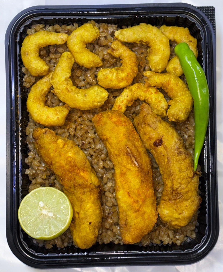 طلب وجبة المزاج العالي من بومبا: تشكيلة من الجمبري المقلي، السمك الفيليه، مع وسلطات. الطعم الأصلي للفوسفور في مدينة نصر